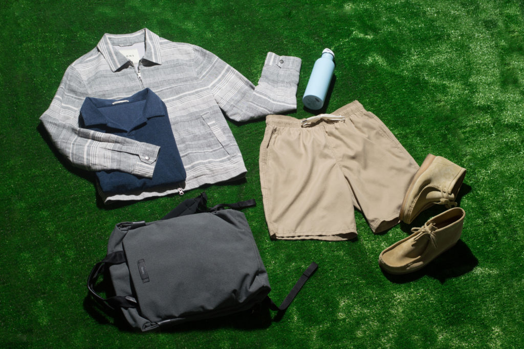 Clockwise from top left: Richer Poorer Socks; Scout Windbreaker; Raen Benson Sunglasses; Linen Anton SS Shirt; Linen Modern Short; and Horizon Crew Neck.